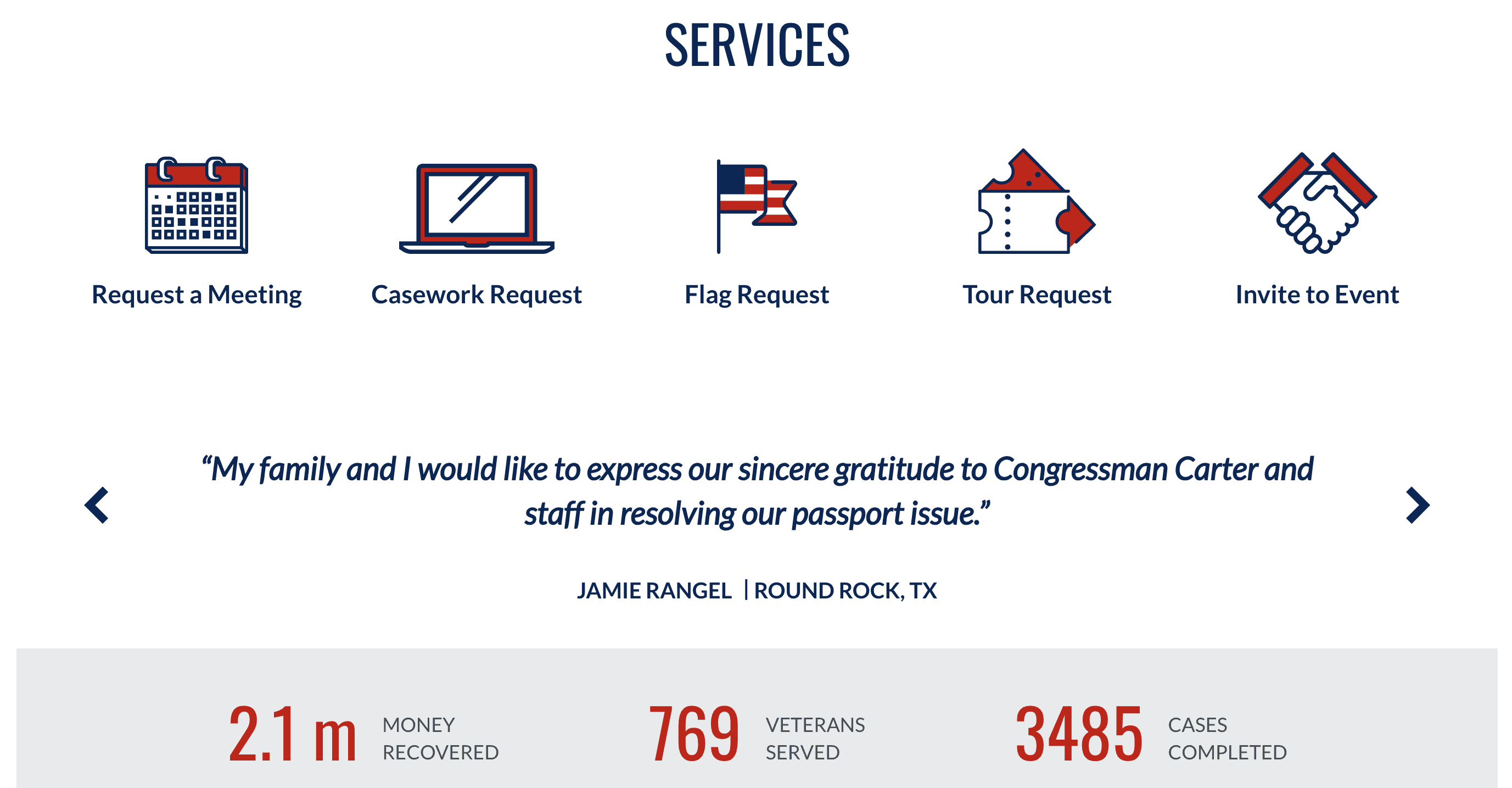A good example is Rep. Carter’s website, which uses bold, distinct, and primary colors, ensuring those with visual impairments can navigate the site.